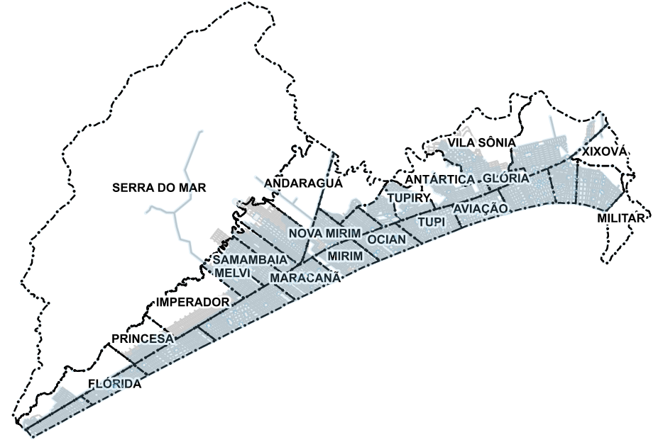 A organização do território da Estância Balneária de Praia Grande é subdividida em 32 (trinta e dois) bairros, conforme estabelecido na Lei Complementar nº 473 de 27 de dezembro de 2006, com delimitação constante da Carta Oficial “Logradouros Públicos, Loteamentos e Bairros”. Os dados aqui relacionados apresentam as praças do município e como elas são implantadas na cidade.